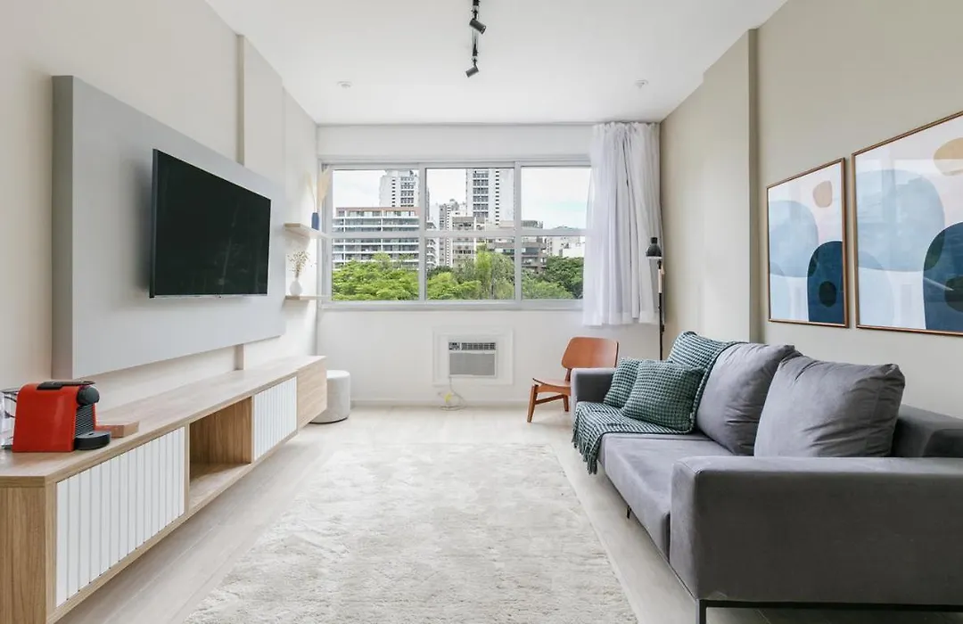 Featuring a writing table, Tabas Lindo Ap 3Qtos No Leblon Lb0043 Apartment apartment has a TV set, an iron/ironing board, and amenities such as climate control. The property includes 2 bedrooms. The accommodation is equipped with a bathroom that features a hair dryer.